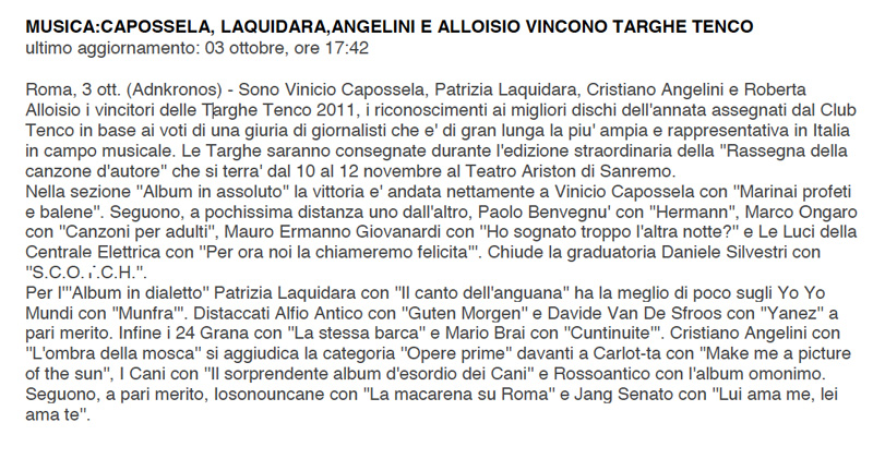 - Musica:Capossela, Laquidara, Angelini e Alloisio vincono Targhe Tenco (ADNKRONOS)