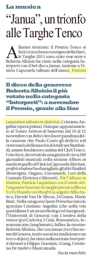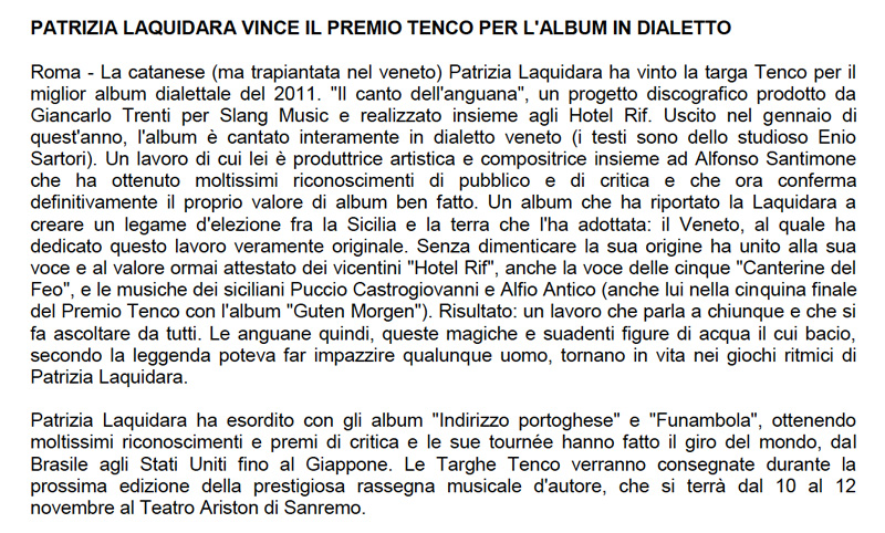 - Musica: a Patrizia Laquidara Targa Album in Dialetto Premio Tenco 2011 (Libero-News.it)