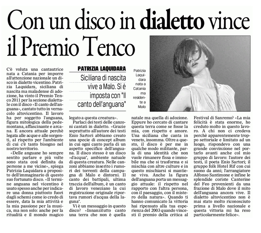 - Con un disco in dialetto vince il Premio Tenco (Il Gazzettino)